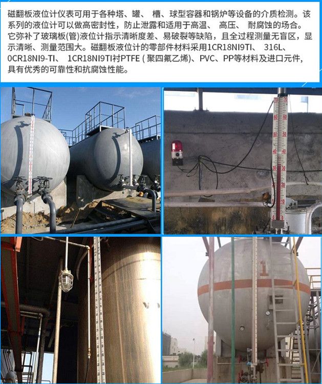 磁翻板液位計廣泛用于石油、化工、油田、醫(yī)藥、食品、酒業(yè)等行業(yè)中各類貯液罐、貯槽、貯液池、反應(yīng)罐、發(fā)酵罐內(nèi)液體、油田、液化氣、液氫、強酸堿液、弱酸堿液、發(fā)電廠鍋爐汽包、高低加、回水箱高低壓加熱器、凝結(jié)器、蒸發(fā)患有主其他壓力容器內(nèi)與1Cr8NitTi、304+PTEE(聚四氟乙烯)、316L、PVC、PP相容液體介質(zhì)的液位、液面及兩種不同介質(zhì)界面測量與顯示。