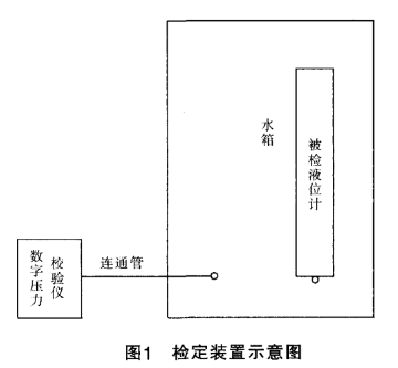 該檢定裝置如圖1所示,包括數(shù)字壓力校驗儀、水箱、連通管、水箱、各種液位計接口和固定裝置。