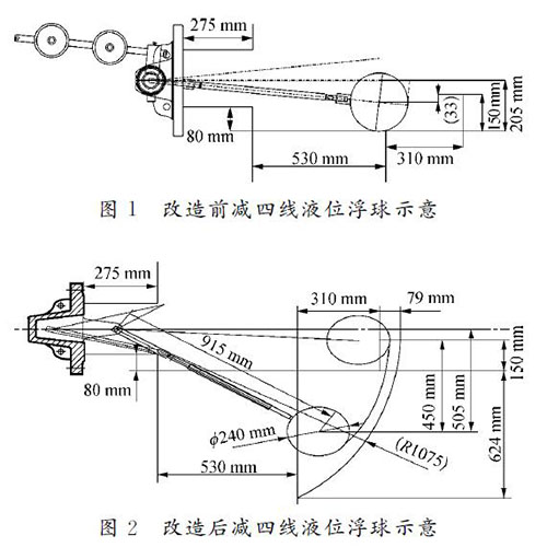 針對(duì)減四線液位測(cè)量進(jìn)行大轉(zhuǎn)角、切割集油箱改造,有效量程大于設(shè)計(jì)量程的80%,其改造測(cè)繪圖如圖2所示。改造后,安裝支架120 mm,插入深度為1?。保担担恚恚瑢?shí)際測(cè)量液位達(dá)450mm,儀表接液部位全部選用317材質(zhì)。轉(zhuǎn)軸—杠桿套筒、杠桿套筒—連桿、浮球—連桿的固定連接節(jié)點(diǎn)及加工焊接坡口增加焊接強(qiáng)度;對(duì)于活動(dòng)節(jié)點(diǎn),采用專用銷子固定。