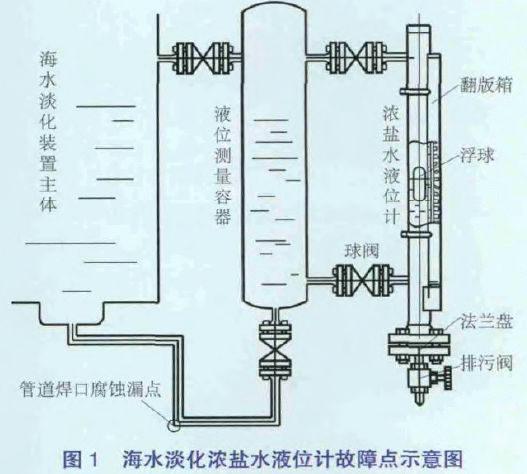 2013年12月16日0:20海淡水化裝置主體U3濃鹽水液位計開始出現(xiàn)30%~70%的波動,檢查液位計本體無異常,將液位計上、下閥門關小后,液位測量波動減小,但故障現(xiàn)象并未消失。利用高爐休風機會降海水淡化U3 主體負荷并查找故障原因。將液位計上、下閥門全關閉并拆下下部絲堵,打開排污閥徹底進行排氣排污處理,檢測磁性浮子,未發(fā)現(xiàn)異常。當投運后波動現(xiàn)象存在。濃鹽水液位計更換后再次試投運,發(fā)現(xiàn)液位計液位顯示波動更大、更頻繁。經(jīng)過排查發(fā)現(xiàn)與液位測量容器(見圖1)連接的管道焊接處有漏點,對該漏點進行封堵后液位測量顯示恢復穩(wěn)定,負荷狀態(tài)生產(chǎn)恢復正常。