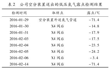 2016年2月14日在X4閥處檢測氮?dú)獾穆饵c(diǎn)為-71.4℃,與空分裝置外送氮?dú)獾穆饵c(diǎn)一樣,表明低壓氮?dú)夤芫W(wǎng)中的水已經(jīng)完全排出。