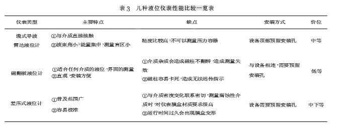 通過以上案例分析,幾種液位檢測(cè)儀表在液氨儲(chǔ)罐上的應(yīng)用各有不同的使用效果,現(xiàn)將其性能指標(biāo)歸納如下,供設(shè)計(jì)選型及儀表維護(hù)人員參考。