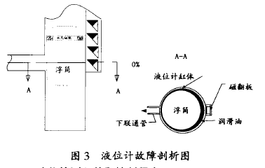 持續(xù)向空貯罐加油至液位計指示值37%時,用時約15min。反之,排油液位計回零用時大于40min。在其它區(qū)域液位變化則快許多。通過對粗苯防爆液位計結(jié)構(gòu)分析,我們發(fā)現(xiàn):圓柱體浮筒(~58mm×280mm)浮在0% ~37%區(qū)間時,形同一個柱塞擋住了液位計簡體下部的聯(lián)通管管口(見圖3,