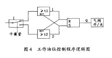液位計筒體內(nèi)徑d/~i0mm,標尺長750mm。750mm×20%=150mm,280÷750=37.3%),液位計油位滯后于貯罐油位變化。液位計回油時,浮筒漂向管口,則阻尼作用更強了,低油位*限開關(guān)LB/LVL6不能及時動作和關(guān)閉氣閥LB/EV2是造成貯油罐泄空而計算機未執(zhí)行油位故障處理程序的原因。圖3 液位計故障剖析圖3.2 液位檢測開關(guān)和控制程序干簧管式接近開關(guān)本身依靠磁控開或合,易受周圍磁場干擾產(chǎn)生誤動?,F(xiàn)場液位計安裝位置一側(cè)與電纜橋架相鄰,而另一側(cè)常有行車電磁吸盤吊裝鋼卷作業(yè)。從工作油位控制邏輯過程可以看出(圖4):盡管油位檢測開關(guān)已通,每15s(t1=t2=15s)內(nèi),只要存在一次脈沖干擾,開氣閥電路回路將未被選通。反之亦然。因此,干簧管式接近開關(guān)誤動產(chǎn)生錯誤控制,也是釀成事故的另一個原因。