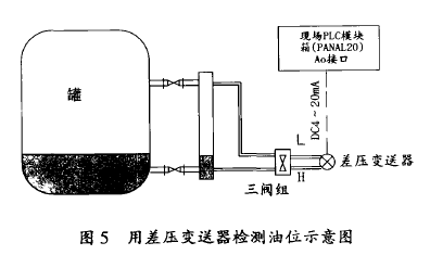 用差壓法檢測油位(△P=p•h)。在上、下聯(lián)通管處開孔取壓,選用智能差壓變送器(*大測量范圍0~10kPa,耐壓力1.6 a,輸出DC 4~20mA,帶顯示表)檢測差壓。標定時,取工作用油壓力0~750ram油柱(為保證p值不變)作為輸入,并使表頭指示為0%~100%(線性關(guān)系)即可。差壓變送器輸出信號接入現(xiàn)場PLC模塊箱PANAL20的模擬量輸入通道,與軋線計算機聯(lián)網(wǎng)(見圖5)。