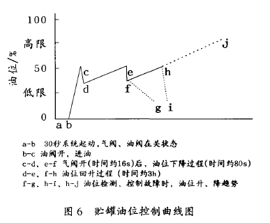 當檢測到油位低*限位開關(guān)信號(油位標尺的20%處,LB/LVL6動作)時,開始計時,氣閥在45s內(nèi)處在關(guān)閉狀態(tài),使罐內(nèi)油位上升。油位低信號解除后,進入正常工作油位控制程序。若45s后油位低信號仍然存在,則執(zhí)行油位低故障處理程序。