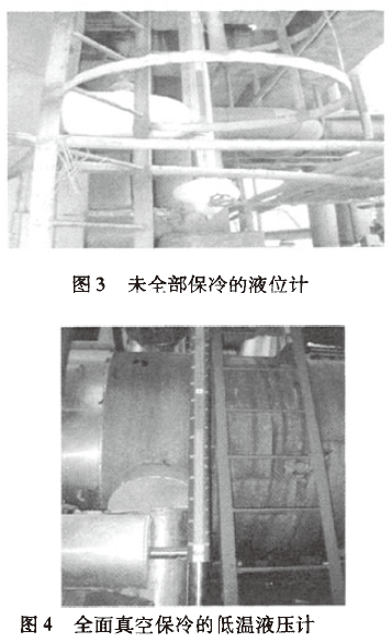 從圖3和圖4可見(jiàn),平衡連通管無(wú)真空保溫層的液位計(jì),有冷凝冰塊出現(xiàn)。加了之后,冷凝冰塊全部消失。
