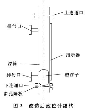 (3)方案3。改造現(xiàn)有的液位計,采用上下端日連接,上過程進(jìn)日改為排氣口,下過程進(jìn)日改為排污口,原安裝浮子法鑄和排氣閥接日改為連通日,在下部增加一個多孔隔板,保證浮子不進(jìn)人工藝管線,同時保證液體的正常流動。在保證不改變液位計結(jié)構(gòu)情況下,將液位計與工藝管線連接。此方案優(yōu)點是花費少,不閑置設(shè)備,并且還能達(dá)到液位計與管線清理同步,實現(xiàn)維修與檢修同步。