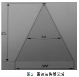 我公司有6臺硫酸儲罐,罐體間可實現(xiàn)連通,為保證測量的精度和安全性,我公司分別在6個罐體上分別安裝了雷達液位計,互為備用,并且在正常情況下還可以實現(xiàn)兩個液位測量值的準確度參照比較。在安裝雷達波液位計時,剛開始采用傾斜的安裝方式,其傾斜角度不超過15°,調試液位計儀表時發(fā)現(xiàn)無物位數(shù)據(jù)顯示,分析故障原因是由于發(fā)射的雷達波到達罐體鋼板上反射回來的,其主要原因是產(chǎn)生的虛假回波干擾太大造成的。重新調整雷達液位計的安裝角度后發(fā)現(xiàn)出現(xiàn)物位數(shù)據(jù),但該數(shù)據(jù)波動很大,并且由于分析原因可能是因為液面波動對雷達波反射造成影響,基于此原因,決定在罐內的測量筒內安裝反射板,重新調整雷達物位計的安裝,使其雷達波的發(fā)射天線平面與反射板平行,這樣測得的物位數(shù)據(jù)比較準確。反射板的面積計算:采用FMR530智能型雷達液位計,其天線尺寸參數(shù)DN80/3",波束角α=10°,雷達波傳播的區(qū)域如圖2 所示。根據(jù)公式Tan5°=W/2D,可求出W=900 mm,進而求出反射板的面積。因此我們可以制作一個直徑不小于900 mm的圓盤即可。