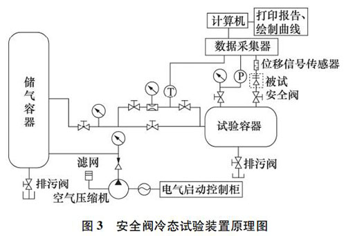 安全閥冷態(tài)試驗(yàn)裝置( 見(jiàn)圖 3) 主要由壓縮氣源、儲(chǔ)氣罐、節(jié)流控制閥、試驗(yàn)罐、閥門和管道、數(shù)據(jù)采集系統(tǒng)、控制系統(tǒng)等組成,可對(duì)公稱壓力 PN≤20 MPa,公稱通徑 DN≤150 mm 的安全閥進(jìn)行整定壓力試驗(yàn)、排放壓力試驗(yàn)、回座壓力試驗(yàn)、開啟高度試驗(yàn)、排量及排量系數(shù)試驗(yàn),檢測(cè)參數(shù)和自動(dòng)化程度達(dá)到國(guó)內(nèi)**水平。