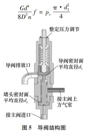 忽略重力和摩擦力因素的影響,對(duì)導(dǎo)閥的動(dòng)作過(guò)程進(jìn)行受力分析,導(dǎo)閥結(jié)構(gòu)如圖 5 所示。當(dāng)系統(tǒng)壓力升高達(dá)到整定壓力時(shí),氣體在導(dǎo)閥密封面處克服導(dǎo)閥彈簧預(yù)緊力向上頂起導(dǎo)閥的閥芯,此時(shí)應(yīng)滿足: