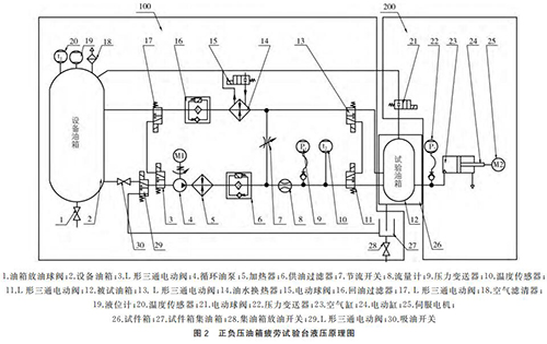 (1)循環(huán)油液控制回路,如圖2中100部分。這個部分主要由“保溫油箱、液位計、過濾器、循環(huán)油泵、加熱器、流量計、電動三通閥、油水換熱器、耐酸堿磁翻板液位計、溫度傳感器等組成”;被試油箱滑油供回油口連接在試件箱內(nèi)供油軟管和回油軟管之間,即可對被試油箱內(nèi)部油液流動要求及溫度進行控制。