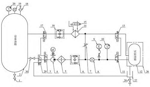 油液供油:原理中油液經(jīng)吸油開關(30)、L 形三通電動閥(3、29)、油泵(4)、加熱器(5)、供油過濾器(6)、流量計(8)、L 形三 通 電 動 閥(11)后進入被測油箱,然后 經(jīng) L形三通電動閥(13)、油水換熱器(14)、回油過濾器(16)、L 形三通電動閥回到設備油箱中,此條支路可提供被測油箱剛安裝于試驗臺上時的油液供給,通過流量計軟件計時的方法判斷補油量。