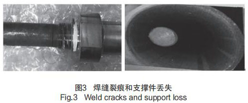 在歷次大修執(zhí)行 GSS 系統(tǒng) MSR 熱水箱液位計預防性維修檢查時發(fā)現(xiàn),部分導波桿支撐件破碎并丟失,同時存在探桿根部焊縫有裂痕的問題,見圖 3 焊縫裂痕和支撐件丟失。