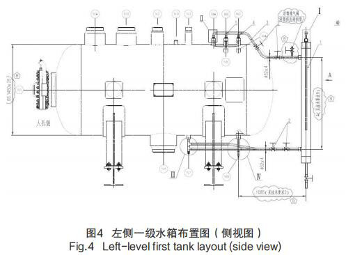 1)在每個疏水箱外部靠近水側取壓口處,安裝 3 個測量筒用于導波熱水箱液位計的安置以及液位測量;每個測量筒的汽側取壓口仍然選用原導波熱水箱液位計接口,而水側取壓口引用原水汽取樣口、磁翻板液位計取壓口,以左側一級水箱布置圖為例,見圖 4 左側一級水箱布置圖(側視圖)。