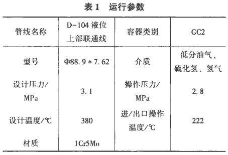 該裝置于2016年9月開工轉人正常運行,2016年9月7日發(fā)現(xiàn)D-104液面計上引出線有冒油氣現(xiàn)象,現(xiàn)場檢查發(fā)現(xiàn)D-104液面計上接管引出線法蘭后焊縫靠上部有裂紋現(xiàn)象,車間對泄漏部位進行帶壓鉚擊消漏處理。9月8日該部位再次出現(xiàn)泄漏,裝置停工隔離處理(表1)。