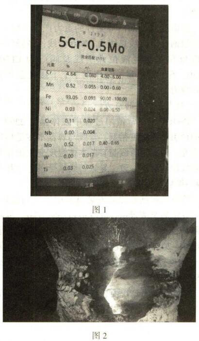 (1)對該段管線進行能譜檢測,確認該管線材質為lCr5Mo,管線材質無問題。