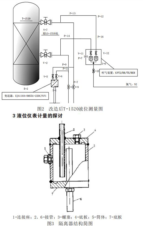 對(duì)溶劑吸收工段吸收塔T-1520進(jìn)行儀表改造,拆除原就地液化石油氣液位計(jì),在原就地液位計(jì)處增加一套反吹法測(cè)量設(shè)備。增加的儀表有:普通磁性浮子液位計(jì)1臺(tái):EJA110A-DMS5A-22DC/NF1、反吹風(fēng)裝置1套、球閥(DN10)3只,¢14不銹鋼管等。圖2為技術(shù)改造后的反吹法測(cè)量液位的安裝效果圖。
