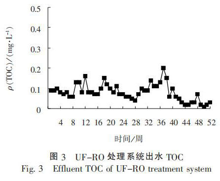 經(jīng)過 1 年的連續(xù)運行, 晶背研磨廢水進水 TOC質(zhì)量濃度為 0.5 ~ 5.0 mg / L, 濁度為 80 ~ 100 NTU,SiO2 質(zhì) 量 濃 度 為 2 ~ 4 mg / L, 反 洗 廢 水 進 水 TOC質(zhì) 量 濃 度 為 1.5 ~ 3.0 mg / L, 濁 度 為 4 ~ 8 NTU,UF-RO 處理出水 TOC 質(zhì)量濃度低于 1 mg / L, 濁度低于 0.1 mg / L, SiO2 質(zhì) 量 濃 度 低 于 1 mg / L, 完 全可以回用至超純水預(yù)處理系統(tǒng)。 UF-RO 處理系統(tǒng)出水電導率和 TOC 濃度見圖 2 ~ 圖 3。
