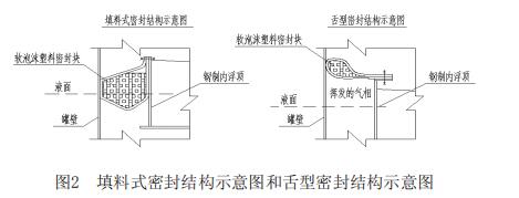 鋼制內(nèi)浮頂與罐壁之間的密封通常采用彈性材料密封結(jié)構(gòu),根據(jù)彈性密封件的結(jié)構(gòu)和斷面尺寸,密封的結(jié)構(gòu)形式主要可以分為填料式密封和舌型密封結(jié)構(gòu)兩大類。兩者的密封結(jié)構(gòu)示意見圖2: