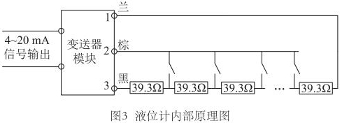 為尋求更好的改進方案,對高溫導熱油液位計的測量原理進行了深入研究。液位計測量桿中是由等間距排布的干簧管和電阻元件組成,當磁浮子達到某一高度時,對應的干簧管閉合,如果能識別出哪個干簧管閉合,即可獲得當前液位值。那么變送器又是如何識別出哪個干簧管閉合的呢?再次探究測量桿內(nèi)部電路,繪制液位計內(nèi)部原理圖,如圖3所示。測量桿內(nèi)部電阻串聯(lián)連接,每兩個電阻的連接處連接干簧管的一端,干簧管的另一端并聯(lián)連接,*終引出蘭、棕、黑三根信號線。