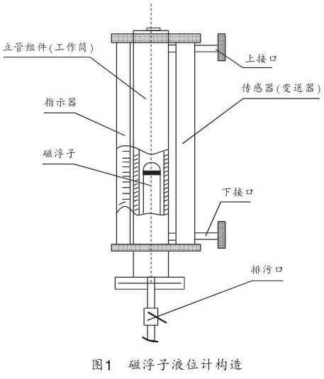遠(yuǎn)傳式高溫渣油液位計(jì)由磁浮子、工作筒、指示器、遠(yuǎn)傳變送器組成,如圖 1 所示。