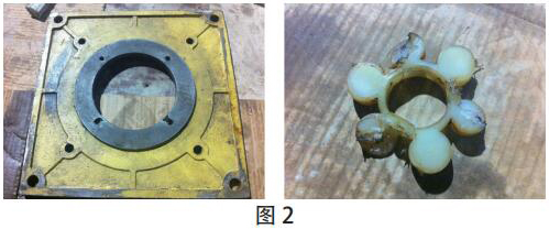 2015 年 9 月 23 日運(yùn)行過程中,02:15 因“機(jī)組高位油箱低油位動(dòng)作”停機(jī)。現(xiàn)場(chǎng)拆解稀油站 1# 低壓油泵,發(fā)現(xiàn)油泵與底座 2 顆連接螺栓脫落、出油管松脫、底座螺孔拉崩、螺孔周圍多處裂紋、緩沖墊破損等諸多問題。造成油泵無法供油,引起停機(jī)。如圖 2 所示。