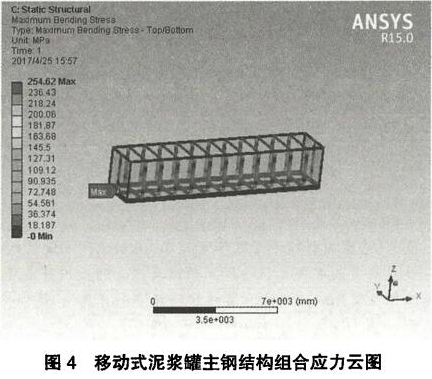 (3)導(dǎo)熱油液位計罐體材質(zhì)為Q345b低合金鋼,使用時放置于地面,對結(jié)構(gòu)底部設(shè)置位移約束141。2.2應(yīng)力分析基于上述載荷和邊界條件,經(jīng)過計算,儲存罐罐面結(jié)構(gòu)的Mises應(yīng)力*大值出現(xiàn)在側(cè)端面底部,*大值為185.83MPa;儲存罐主鋼結(jié)構(gòu)*大彎曲應(yīng)力與*大組合應(yīng)力出現(xiàn)在側(cè)面加強槽鋼底部,分別為254.62MPa與265.08MPa(圖2 ̄圖4)。