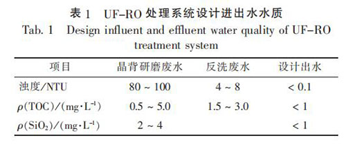 國內(nèi)某酸液液位計廠, 晶背研磨廢水產(chǎn)生量為 150 ~160 m3 / d, 反洗廢水產(chǎn)生量 為 500 ~ 700 m3 / d, 主要污染物為懸浮物, UF-RO 處理系統(tǒng)設計進水和出水主要水質(zhì)指標見表 1。