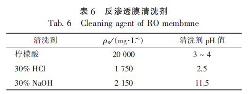 反滲透膜運行一定時間后, 污染物會在膜表面沉積, 需要定期進行化學清洗以完全恢復膜性能。 本系統(tǒng)設計清洗周期為 3 個月, 清洗包括循環(huán)、 浸泡、 沖洗 3 個過程, 將清洗劑引入反滲透膜 組 , 按 每 支 膜 11.4 L / min 的 流 量 循 環(huán) 5 ~ 15min, 再將單支膜流量調(diào)至 22.8 L / min 循環(huán) 5 ~ 15min, 然后再將單支膜流量調(diào)至 35 L / min 循環(huán) 30 ~60 min, 隨后進入浸泡階段, 1 ~ 2 h 后進行沖洗,直至濃水電導率與進水電導率相同。 反滲透膜采用先酸洗后堿洗的步驟進行, 酸洗和堿洗均經(jīng)過上述過程, 酸洗劑可選用檸檬酸或 HCl, 堿洗劑選用 NaOH。 清洗劑選擇見表 6。