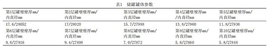 (1)改造前對儲罐的罐體進(jìn)行了超聲波測厚以及材料的化學(xué)成分及性能分析,其材質(zhì)滿足現(xiàn)行的使用條件,其儲罐的罐體參數(shù)及每層罐壁的厚度(實測)見表1,罐壁的每層壁板高度為1690mm,其搭接寬度為40mm,縱焊縫為對接結(jié)構(gòu),見表1。