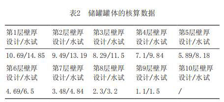 根據(jù)GB50341-2014《立式圓筒形鋼制焊接油罐設(shè)計規(guī)范》中的規(guī)定,儲罐內(nèi)徑小于60m,采取的是定設(shè)計點發(fā)進(jìn)行核算[3],核算出的儲罐的每層罐壁的所需厚度(mm)(設(shè)計與試水條件下)見表2。