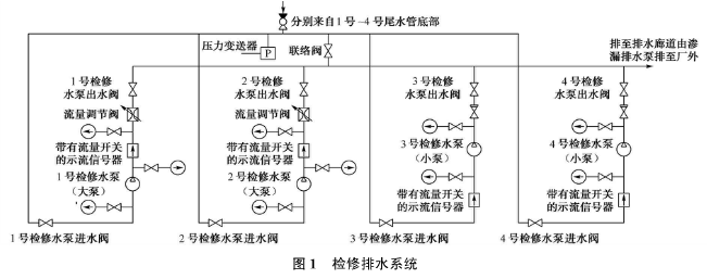 桐柏電站的檢修排水系統(tǒng),共設(shè)4臺(tái)排水泵,如圖1所示,1號(hào)、2號(hào)檢修水泵(大泵)用于排空引水隧洞、蝸殼、尾水管、尾水隧洞內(nèi)的水;3號(hào)、4號(hào)檢修水泵(小泵)用于球閥、上下庫(kù)閘門(mén)等的滲漏排水。每臺(tái)檢修水泵均配置逆止閥、壓力表和帶流量開(kāi)關(guān)的示流信號(hào)器,在1號(hào)、2號(hào)水泵出水管處各安裝了一個(gè)流量調(diào)節(jié)閥。系統(tǒng)中共有2根總管,一根為水泵的總吸水管,包括從每臺(tái)機(jī)組尾水管底部至總管的支管,總吸水管和部分支管及管路上的操作閥門(mén)布置在廠房管路廊道中;另一根為總排水管,可將水排至滲漏集水井中,再經(jīng)滲漏排水泵排至下庫(kù)。