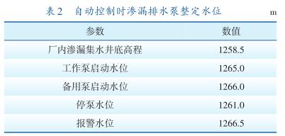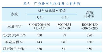 呼蓄電站廠(chǎng)房排水系統(tǒng)包括地下廠(chǎng)房滲漏排水系統(tǒng)、機(jī)組檢修排水系統(tǒng)。地下廠(chǎng)房滲漏排水系統(tǒng)設(shè)有1個(gè)滲漏集水井,有效容積364 m 3 ,設(shè)5臺(tái)滲漏排水泵,3運(yùn)2備,系統(tǒng)*大滲漏總排水量為2250m 3 /h。滲漏排水泵正常運(yùn)行時(shí)由廠(chǎng)內(nèi)滲漏排水控制盤(pán)PLC或監(jiān)控系統(tǒng)自動(dòng)控制啟停,也可就地通過(guò)每臺(tái)泵的啟動(dòng)柜手動(dòng)啟停。自動(dòng)控制時(shí)整定水位見(jiàn)表2。廠(chǎng)房排水系統(tǒng)設(shè)備主要參數(shù)見(jiàn)表3。