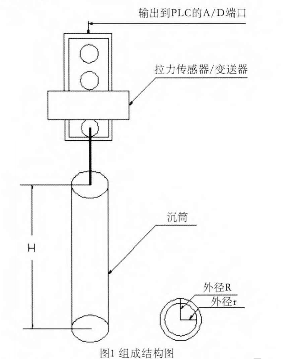 沉筒式液位計主要由拉力傳感器、變送器及沉筒組成,拉力傳感器內部貼有電阻應變片,通過信號線將變送器輸出的標準電流信號送到PLC的A/D輸入端口,用以進行數(shù)據(jù)處理和遠程控制。沉筒由上下兩端封閉的空心材料制成,并懸掛在拉力傳感器的受力端,其余部分投入到儲料罐中,拉力傳感器用法蘭盤或自帶螺紋固定在儲料罐的上方,結構如圖1所示。
