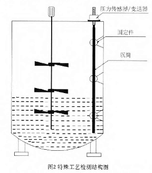 在某些工業(yè)材料的制備過程中需要用到攪拌使材料混合均勻,達到工業(yè)用料的要求。即使液體始終處于攪拌狀態(tài)下,液體表面波動較大,罐體還有明顯的震動,再加上蒸汽、粉塵等比較惡劣的環(huán)境,傳統(tǒng)的液位檢測裝置無法正常工作。利用這種沉筒式液位計能很好的解決這一問題,并且能夠通過軟件去除誤差相對較大的數(shù)據(jù),保證檢測的精確性,其檢測結構如圖2所示。