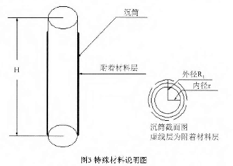當材料本身有粘附性和凝固性時,沉筒的表明會附著一層或幾層材料,導致其體積發(fā)生變化,自身的重量也發(fā)生變化,其變化如圖3所示,其中沉筒截面積中虛線層為附著材料層,設此時沉筒外徑為R1。