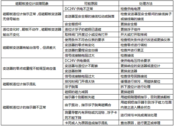磁翻板液位計常見故障的檢查及處理如表1所示。