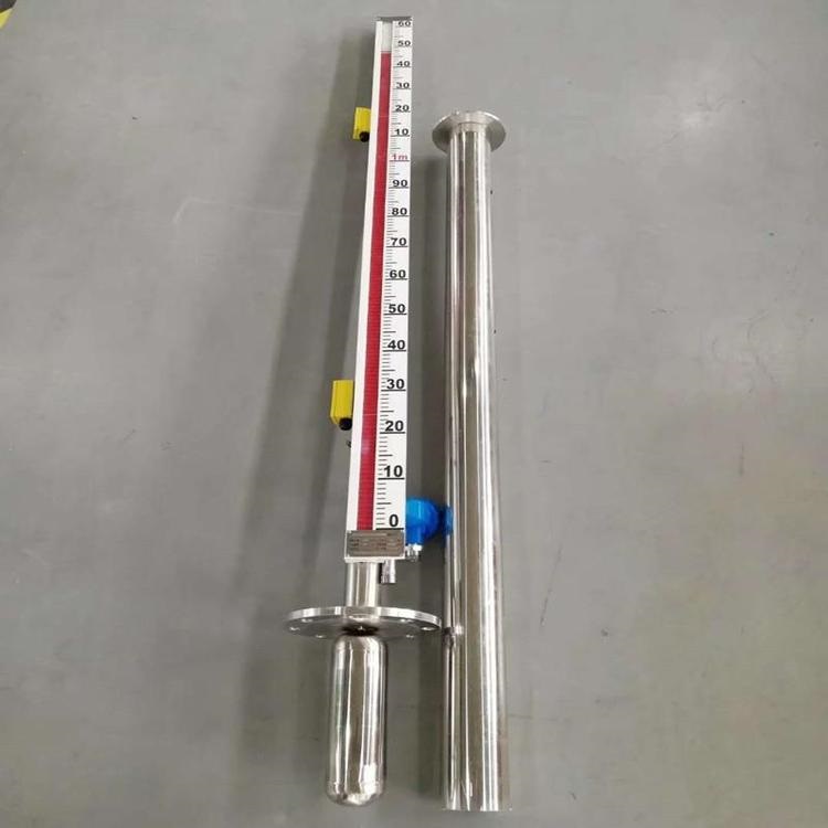 原理:根據(jù)浮力原理和磁性耦合原理而制成的,當被測容器內(nèi)的液位上下變化時帶動浮球,并通過與之相連的連桿上端的永久磁鋼上下移動,經(jīng)磁性藕合而使顯示器中的翻柱翻轉(zhuǎn)。當液位上升,翻柱由白色轉(zhuǎn)為紅色,當液位下降時翻柱由紅色轉(zhuǎn)為白色,紅白界位處就為容器內(nèi)介質(zhì)液位的實際高度,從而實現(xiàn)液位自動跟蹤顯示。