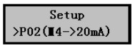 1)在污水液位計正常工作時按擊Mode鍵進(jìn)入?yún)?shù)設(shè)置菜單后按擊▼鍵選擇P02(4~20mA)設(shè)置菜單,如右圖。