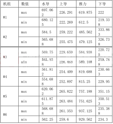 從監(jiān)控系統(tǒng)取出的數(shù)據(jù)有#1-#6 機(jī)組的水導(dǎo)、上導(dǎo)、推力、下導(dǎo)各部軸承油位數(shù)據(jù),分別有機(jī)組檢修后未開機(jī)的油位、機(jī)組運(yùn)行時的油位、機(jī)組運(yùn)行后停機(jī)的油位三種機(jī)組狀態(tài)下的數(shù)據(jù),計算分析如下: