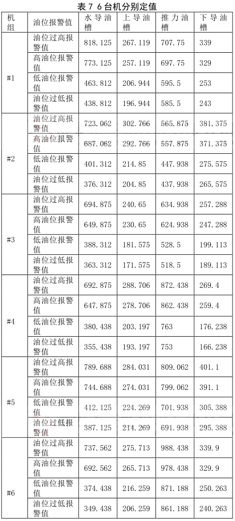 (2)依據(jù)成都勘測設(shè)計院給的定值要求,建議每臺機(jī)設(shè)置不同的報警值。設(shè)置原則:在上導(dǎo)、下導(dǎo)、推力各部油槽油位,結(jié)合機(jī)組運(yùn)行時的油位*大值上設(shè)置高油位報警值+20mm、過高油位報警值 +30mm;*低油位值上低油位報警值 -20mm、低油位停機(jī)值 -30mm;水導(dǎo)油槽油位:高油位報警值 +45mm、過高油位報警值 +90mm;*低油位值上低油位報警值 -130mm、低油位停機(jī)值 -155mm;躲過報警值。在此基礎(chǔ)上,真實的油位只會下降,設(shè)置值對油位的運(yùn)行是安全的。分析確定的#1-#6 機(jī)組各油槽油位的動態(tài)油位報警值,即機(jī)組運(yùn)行時油槽油位的過低、低、高、過高報警定值如下,可以選擇表 9 的數(shù)據(jù) 6 臺機(jī)分別進(jìn)行定值,同時也提供定值表 10 進(jìn)行 6 臺機(jī)統(tǒng)一進(jìn)行定值。