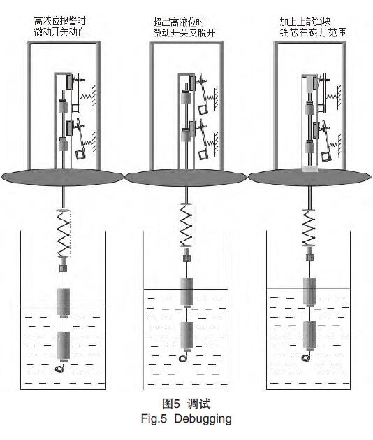 3)在調(diào)試過程中,發(fā)現(xiàn)液位開關(guān)沒有自保持功能,當(dāng)高報(bào)警點(diǎn)過后,液位再往上升則高液位報(bào)警會消除,低液位時(shí)也是同樣,在分析原因后發(fā)現(xiàn),鐵芯在套筒內(nèi)移動的位置不當(dāng)是造成不能自保持的原因,如圖5所示,于是在套筒內(nèi)的鐵芯上方加一阻擋塊,使高液位超出時(shí),鐵芯被阻擋塊擋住,不再向上移動,從而不會脫出微動開關(guān)的磁力范圍,對低液位報(bào)警的自保持是在鐵芯的下部加一個環(huán)型的墊片,阻止鐵芯向下移動超出微動開關(guān)的磁力范圍。從而提高了可靠性和重復(fù)性。接下來的調(diào)試中,又出現(xiàn)了一些零零碎碎的問題,如磁鐵磁性不夠,或者彈簧彈性不夠,彈簧的抗疲勞性差。元器件的材料和加工工藝不理想,出于對核電的安全性和穩(wěn)定性的考慮,開始考慮使用國外公司的產(chǎn)品,在試用后沒有出現(xiàn)以上的問題,于是決定從新采購一批國外的液位開關(guān),將有問題的液位開關(guān)更換成國外的產(chǎn)品。