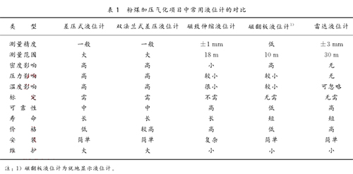 目前在粉煤加壓氣化項目中常采用的液位計類型主要有:差壓式液位計、雙法蘭式差壓液位計、磁致伸縮液位計、磁翻板液位計、雷達液位計等。這幾種液位計各有特色,都存在著一定的優(yōu)勢與不足,性能對比結(jié)果見表1所列。