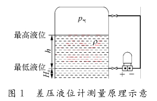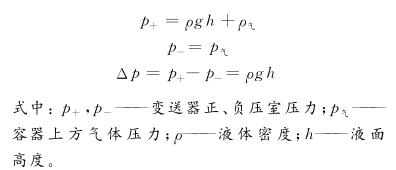 在粉煤加壓氣化工藝流程中,冷卻水、冷凝水是干凈潔凈的介質(zhì),測量該介質(zhì)的液位如無特殊情況,選用普通的差壓式液位計即可。差壓式液位計是利用流體靜力學原理,通過測量流體的壓差來計算出液位的高低,其測量原理如圖1所示。這種方法簡捷、方便,但是準確度與穩(wěn)定性不高,而且測量結(jié)果受到介質(zhì)密度的影響,為滿足測量精度常需要進行補償或采用組合式儀表測量方案。