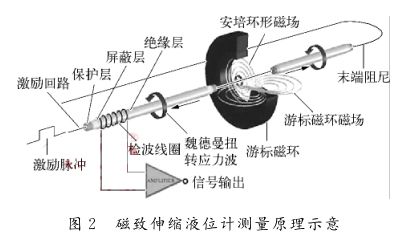 這樣的選型設計,雖然能夠滿足測量準確度的要求,但相應增加了購置成本,并且根據(jù)項目應用的實際反饋,現(xiàn)場存在泄漏點多、安裝與維護較復雜等問題。因此在新的伊泰杭錦旗項目中,由于項目所在地的晝夜溫差較大,冬季環(huán)境溫度*低,改用側(cè)裝3臺磁致伸縮式液位計并配磁翻柱顯示器來替代原先的差壓式測量方案。磁致伸縮式液位計主要依據(jù)磁致伸縮原理而工作,工作原理如圖2所示,由傳感器電路沿磁致伸縮線(波導絲)發(fā)出電流脈沖,在磁致伸縮線周圍形成環(huán)形磁場,當其與浮子內(nèi)的永磁鐵產(chǎn)生的縱向磁場發(fā)生疊加時,會在浮子位置產(chǎn)生1個扭轉(zhuǎn)脈沖回傳至傳感器的探頭。測量起始脈沖與返回脈沖的時間差來確定浮子的位置,即液面的位置。磁致伸縮液位計具有精度高、使用壽命長、無需調(diào)零校準、易維護、安全性高等優(yōu)點,但是在安裝時要注意:探測桿要保證垂直,不能折彎;做好接地屏蔽工作,以免電磁干擾影響測量效果。