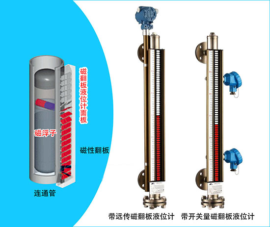 冷凝水液位計主要利用了浮力和磁性偶合來完成指示過程。當(dāng)液位上升時,浮球在浮力作用下由下往上運動,翻柱受到浮球中磁感應(yīng)力的作用翻轉(zhuǎn)180°,顏色由白色變?yōu)榧t色,面板上紅白翻柱的分界位置即為罐體中實際液位高度(如圖1),當(dāng)液位下降時浮球由上往下運動,帶動翻柱翻轉(zhuǎn),顏色由紅色變?yōu)榘咨?br />