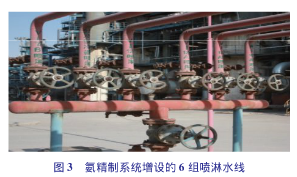 2)液氨儲罐增設(shè)噴淋系統(tǒng)。液氨易溶解于水,裝置增設(shè)霧狀水噴淋系統(tǒng)后,一旦液氨泄漏,從現(xiàn)場打開水噴淋系統(tǒng),就可*大減少氨的揮發(fā)。另外氨具有較高的體積膨脹系數(shù)。如:滿量充裝液氨的鋼瓶,在0~60℃范圍內(nèi),液氨溫度每升高1℃,其壓力升高約1.32~1.80MPa,致使液氨氣瓶超裝*易發(fā)生爆炸。為此液氨裝車點(diǎn)、液氨儲罐設(shè)置了降溫噴淋裝置。同時(shí),要求用罐車?yán)\(yùn)液氨時(shí),其充裝系數(shù)不得大于0.9。在新建120t/h的酸性水汽提裝置中,不但在液氨儲罐上增設(shè)噴淋系統(tǒng),而且在粗氨分液罐、氨結(jié)晶器、氨液循環(huán)罐等6組設(shè)備均增設(shè)了噴淋系統(tǒng)。具體見圖3。